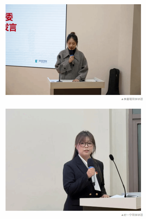 会议伊始,高职青年社区第十一届团委委员代表李星瑶同学与新一届副书记时一宁、潘润瑶同学分别发言,分享了他们在团委工作的感悟与收获。他们谈到,那些为了一项任务共同努力的日夜,那些在学业与学生工作间寻找平衡的经历,都已成为弥足珍贵的成长印记,让大学生活变得充实而绚烂。发言最后,他们激励新一届成员携手并肩,将团委的服务精神与责任使命传承下去,再创辉煌。