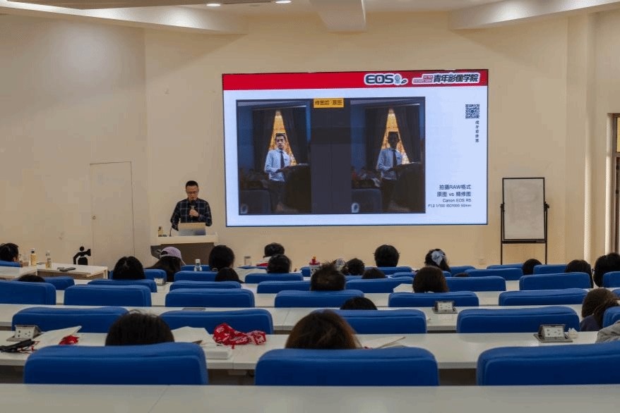 10月15日下午,西安欧亚学院职业教育学院携手佳能EOS青年影像学院,在西C002教室正式启动了一场以“用镜头对话世界,用影像讲述青春”为主题的创意实践课程。现场汇聚了新闻采编与制作、新闻学(专升本)等专业的学生,共同开启一段贴近行业、聚焦实战的影像探索之旅。