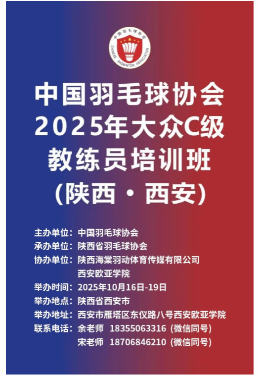 为加强羽毛球大众教练员队伍建设,提升基层教练员的专业技能与教学水平,由中国羽毛球协会主办、陕西省羽毛球协会承办、陕西海棠羽动体育传媒有限公司、西安欧亚学院协办的"2025年大众C级教练员培训班(西安站)"于2025年10月16日至10月19日在西安欧亚学院成功举办。本次培训规模创下历史之最,参与学员达100余人,服务保障人员30余人,彰显了学校在体育人才培养领域的强大组织能力和专业水平。为期四天的培训融合了顶级师资力量与完善的校企合作模式,通过系统化课程设计与严格考核,为我国羽毛球运动基层教练员队伍建设注入了新动能。