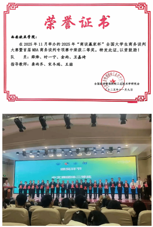 西安欧亚学院职业教育学院组建了跨专业融合团队,成员包括体育运营与管理专业的薛烽、新闻学专业的卫嘉琦、大数据与财务管理专业的时一宁与金雨同学。该团队基于商务谈判课程所学,积极践行“课赛融通”理念,在为期三个月的历程中,团队成员从案例方案撰写、线上模拟演练,到正式比赛的层层角逐,不断优化策略、磨合协作,不仅提升了专业能力,更在团队协作、临场应变等方面得到了全面锻炼。最终荣获团队全国二等奖,充分展现了我院在跨学科复合型人才培养方面的教学成果。