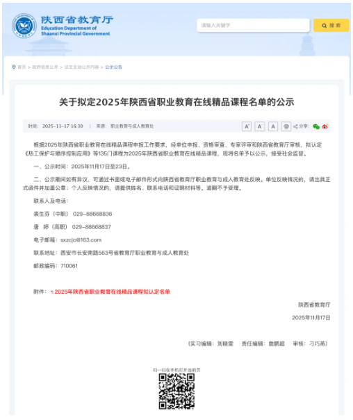 2025年11月17日,陕西省教育厅办公室印发《关于公布2025年陕西省职业教育在线精品课程认定结果的通知》(陕教职办〔2025〕21号),我校职业教育学院体育服务系牵头建设的《大学生应急救护》课程成功入选“2025年陕西省职业教育在线精品课程”,这是我校职业教育课程建设与急救教育特色发展的又一省级权威成果。