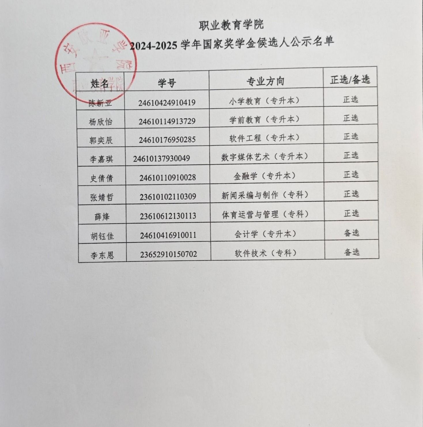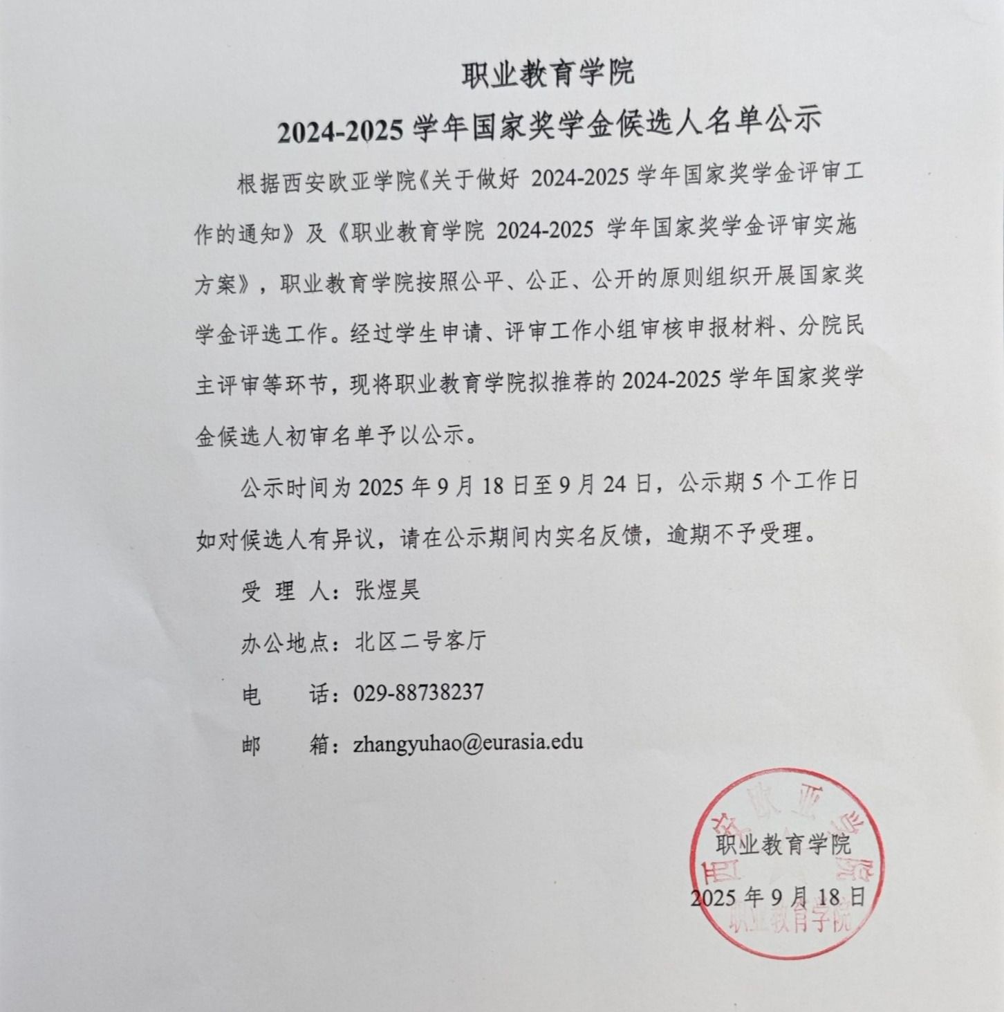根据西安欧亚学院《关于做好 2024-2025学年国家奖学金评审工作的通知》及《职业教育学院 2024-2025 学年国家奖学金评审实施方案》,职业教育学院按照公平、公正、公开的原则组织开展国家奖学金评选工作。经过学生申请、评审工作小组审核申报材料、分院民主评审等环节,现将职业教育学院拟推荐的2024-2025学年国家奖学金候选人初审名单予以公示。